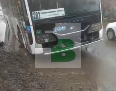 Водитель маршрута №202 «Авиагородок – Ростов-на-Дону» не заметил огромную выбоину из-за лужи. Сначала он ударил переднее правое колесо, а потом заднее. В результате транспорт застрял и самостоятельно выбраться не смог. Пассажирам пришлось ждать следующий рейс.