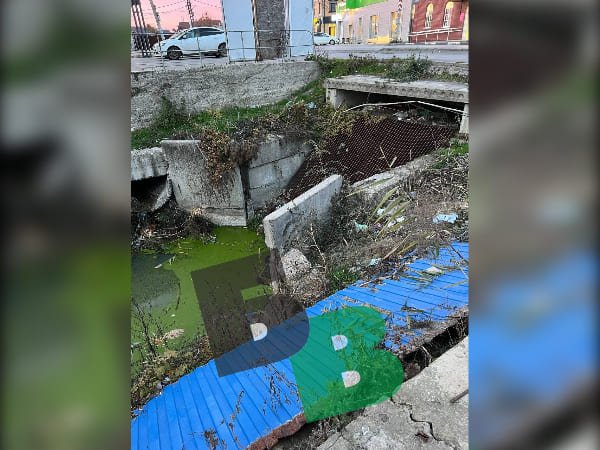 Сильный запах из забитого мусором водостока, упавший забор и прочие отходы создают беспорядок на дороге.