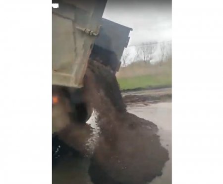 На кадрах «КамАз» выгружает асфальт в лужу с грязью. Какова ее глубина, предположить сложно, однако не менее 15-20 сантиметров. Двое рабочих рядом ждут окончания выгрузки, чтобы начать ровнять. При этом также не видно, есть ли в луже выбоина в дороге и подготовлена ли она к ремонту.