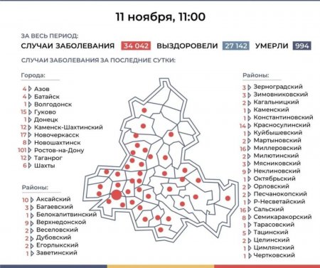 Новые случаи заражения зафиксированы в 42 городах и районах региона. Так, в первой пятерке по количеству инфицированных на 11 ноября оказались Ростов (101), Новочеркасск (17), Миллеровский (16) и Сальский (16) районы, Гуково (15).