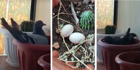 Голубиная пара по очереди высиживает яйца в горшке с цветком (ВИДЕО).