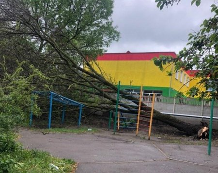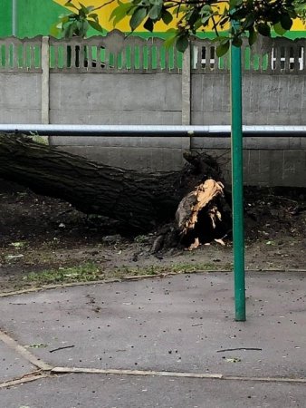Высокое ветвистое дерево уже давно высохло. Скорее всего, растение не выдержало непогоды последних двух дней. Ветер вырвал бывшее зеленое насаждение с корнем. Остается надеяться, что от падающих веток никто не пострадал.