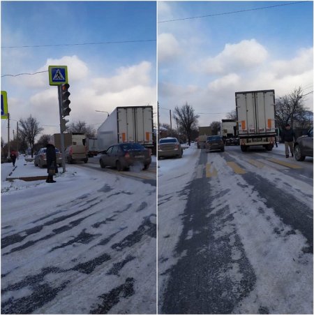 По словам очевидцев, водитель двигался не быстро и пытался затормозить, но это не спасло от столкновения – прицеп задел дорожный знак и угол остановки. Тем более, из-за непогоды дорога частично заснежена.