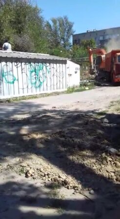 На кадрах – огороженная территория мастерской, экскаватор рушит приют местных маргиналов, собирает обломки кирпичей и мусора в КамАЗ. После этого территорию зачистят. Возможно, на этом месте будет оборудована контейнерная площадка для сбора мусора. На соседнем гараже сидят мальчишки и сверху наблюдают за «историческим моментом в истории РДВС».