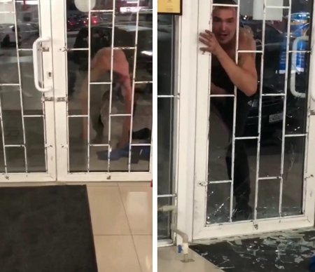 На кадрах мужчина разбил стеклянную дверь магазина бытовой техники, и далее путь ему преградила решетка. Перемежая угрозы нецензурной бранью, мужчина, находившийся, судя по кадрам, в алкогольном или наркотическом опьянении, пытался попасть внутрь. Неадекватный гражданин изрезал в кровь себе руки, но и это его не останавливало.