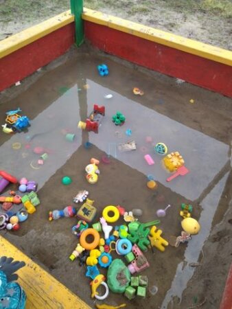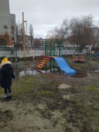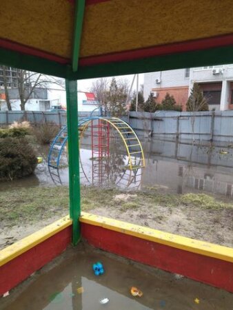 На кадрах видно, как полностью затоплена песочница, - игрушки просто плавают, как в море. Аналогичная ситуация и с горкой. Лужи окружили качели со всех сторон. Получается, дети должны скатываться прямо в жижу. А вдоль забора и вовсе образовалось целое озеро.