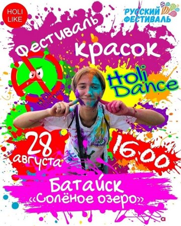 Уже в это воскресенье, 28 августа в 16.00, на Соленом озере в Батайске состоится танцевальный фестиваль красок «Holi Dance». Организаторы приглашают зарядиться позитивом всех желающих любого возраста. Батайчан ждет невероятная атмосфера праздника, различные конкурсы, дискотека и музыкальные батлы.