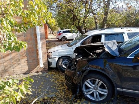 На фото видно, как черный «Фольксваген» врезался в левый бок белой «Лады». Из-за удара отечественная легковушка съехала на пешеходную зону и влетела в стену одного из домов. Пострадавших нет. Автомобили получили повреждения кузова. У «Туарега» смялся капот и выбита фара.