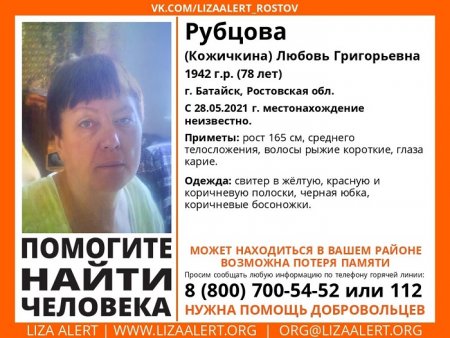 Батайчанка может иметь проблемы со здоровьем, в частности, жительница Батайска страдает потерей памяти, сообщает «ЛизаАлерт Юг» в распространяемой через социальные сети листовке. Призыв помочь установить местонахождение Любови Рубцовой (Кожичкиной) появился накануне, 31 мая.
