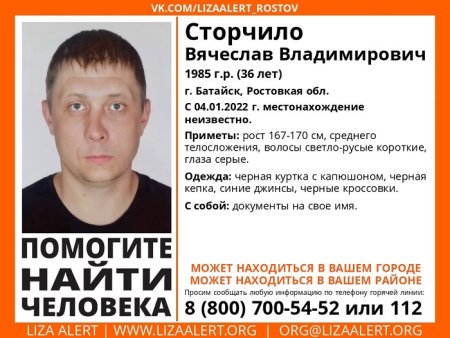 Об исчезновении Вячеслава Владимировича Сторчило сообщили поисковики из команды «Лиза Алерт Юг». Известно, что батайчанин пропал еще 4 января. В этот день Вячеслав ушел из дома, при нем были документы. Где он находится, жив ли, его близкие не знают до сих пор.