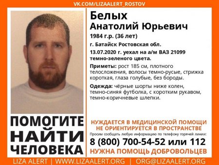 Поисково-спасательный отряд "Лиза Алерт Юг" 15 июля разослал ориентировку на пропавшего в Батайске мужчину. Разыскивается Анатолий Юрьевич Белых 1984 года рождения.