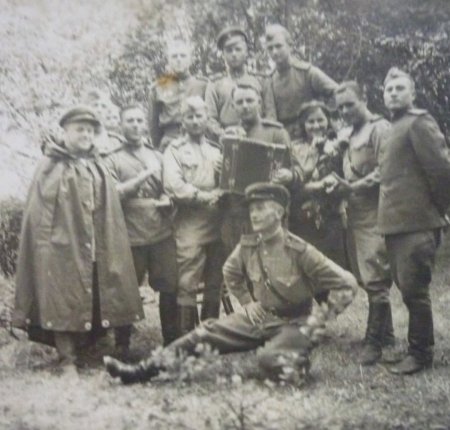 Группа бойцов Красной Армии на опушке леса в Польше, 40-е годы. В центре с гармонью в руках - батайчанин В. С. Кульба.