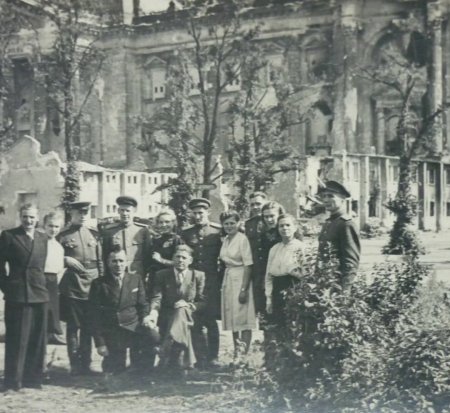 Группа однополчан у стен Рейхстага. В первом ряду - батайчанин Ф. Шмелев. Берлин, 1945 год.