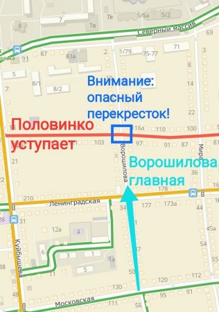 Водители летят по улице Половинко, а знака «Уступи дорогу» не замечают. Видят только, что улица асфальтированная, и воспринимают ее как главную дорогу. Хотя главная здесь – улица Ворошилова.