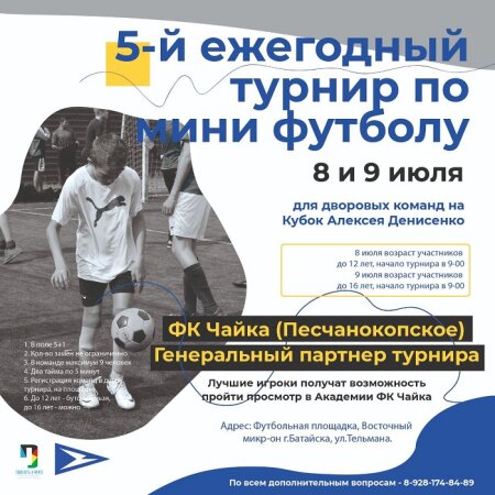 Пятый ежегодный турнир для дворовых футбольных команд запланирован на 8-9 июля. Об этом сегодня, 30 июня, сообщает организатор - НКО БФ «Твой путь к мечте», партнёр Национальных проектов России. Место проведения предстоящего турнира – спортивная площадка на улице Тельмана в Восточном микрорайоне Батайска. За Кубок двукратного олимпийского призера Алексея Денисенко сразятся юные футболисты.