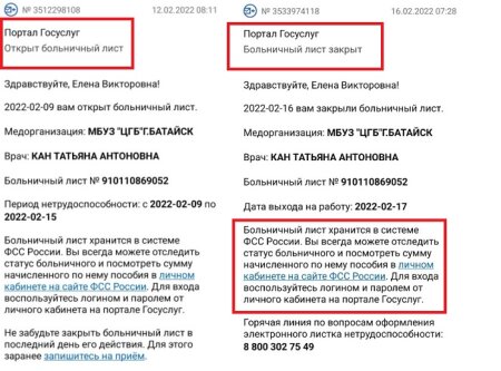 Так и произошло: 10 февраля терапевт связалась с заболевшей, уточнила симптоматику и назначила лечение по телефону. А 12 февраля на Госуслуги сотруднице БВ пришло сообщение об открытии электронного больничного 9-м февраля. Далее наша коллега позвонила 15 февраля терапевту и сообщила, что выздоровела. И сегодня, 16 февраля, пришло сообщение на Госуслуги о закрытие больничного 17 февраля.