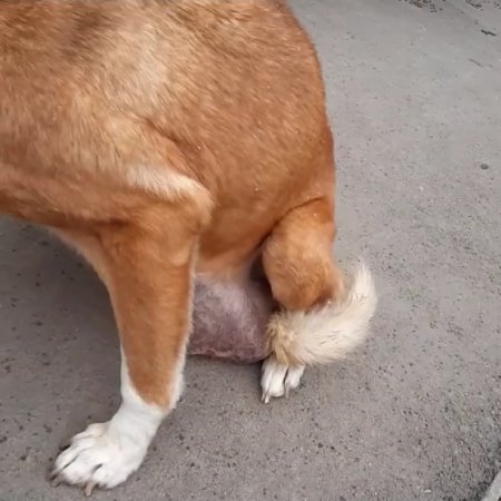 Кадры, которые она сняла, ужасают. У собаки в районе паха образовалась огромная опухоль размером с мяч, которая свисает практически до земли. Когда Татьяна пыталась поймать бедолагу, та прижималась к родной двери в надежде, что сейчас откроет хозяин и пустит ее домой.