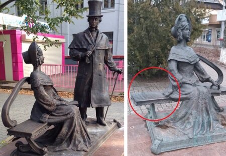Исчезновение части скульптурной формы на днях заметили читатели "Батайского времени". Когда произошел акт вандализма, сложно сказать. Однако, если сравнить два снимка – до и после – заметно, что отсутствует часть спинки скамьи, на которой "сидит" Наталья Гончарова.