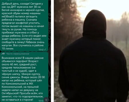 Второе мессендж также был распространен через телефонные чаты. Только в этом случае речь идет о якобы нападении и на ребенка на улице Октябрьской, и на девушку в ЖК «Комсомольский». Только в этом случае люди описывают 40-летнего мужчину в черной куртке, черной шапке и синих джинсах.