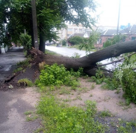 Огромный ствол вырвало из земли с корнем. Он полностью перегородил проезжую часть поперек, так что движение на этом участке (перекресток с улицей Луначарского) пока невозможно. Очевидно, что причиной послужила разыгравшаяся непогода - гроза и сильный ветер.