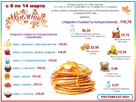 За основу они взяли традиционный рецепт: 1 л молока, 400 г муки, 3 яйца, 100 г растительного масла, 75 г сахара и 5 г соли. Этот набор продуктов в средних ценах февраля стоит 110,74 руб. (блины в прошлом году обошлись на 10,9 руб. дешевле). Среднероссийская цена такой же порции блинов дороже на 4,4%.