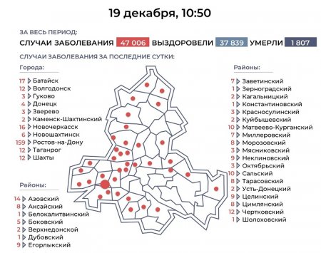 По данным Роспотребнадзора, антилидерами по итогам минувших суток стали: Ростов (159), Батайск (17), Новочеркасск (16), Азовский район (14), Волгодонск (12), Таганрог (12), Шахты (12) и Чертковский район (12). Причем вторая строчка в списке городов с максимальным приростом у Батайска не впервые.