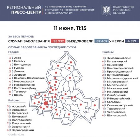 Так, максимальное количество инфицированных было выявлено в Ростове (57), Батайске (8), Таганроге (8), Шахтах (7) и Аксайском районе (5) районе.