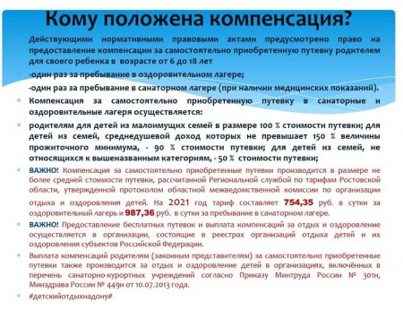 Важно при этом, чтобы лагерь, куда вы отправляете ребенка, находился в государственном реестре. В противном случае получить денежную компенсацию будет невозможно.