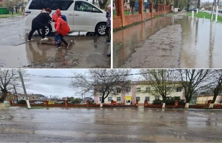 Огромные лужи сделали дорогу к учебному заведению непроходимой. Дети тонут по щиколотку в ледяной ливневке.