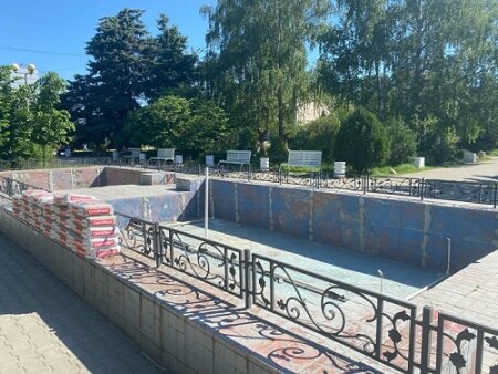 Чашу фонтана отштукатурят и покрасят в голубой цвет. Плитка будет синего цвета, а ограждение останется чёрным. Также запланирован монтаж насосного оборудования. Кроме того, на фонтанной площади уже перекрасили лавочки в белый цвет.