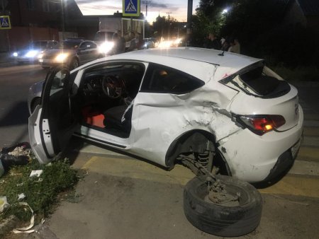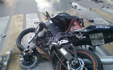 Мотоцикл на полной скорости врезался в заднюю левую часть автомобиля. Свидетели происшествия рассказывают, что удар был огромной силы. У автомобиля, в бок которому врезался мотоцикл, оторвало заднее колесо и смяло корпус.