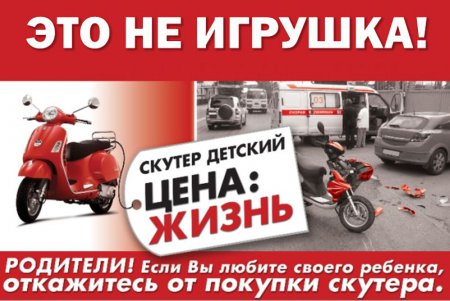 В связи с тем, что участились ДТП с участием мототехники, ОГИБДД по Батайску обратилось к родителям с призывом отказаться от покупки скутеров детям. «Если вы любите своего ребенка, откажитесь от покупки скутера. Скутер детский – цена: жизнь», - говорится в сообщении.