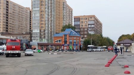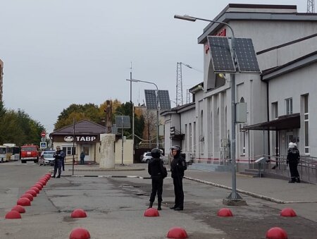 Машины МЧС, скорая помощь, пожарные и полиция заняли позиции вокруг здания ж.д. вокзала города.