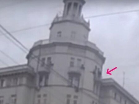 На кадрах видно, как человек стоит в окне седьмого этажа многоэтажки напротив ЦУМа, а после падает прямо на тротуар.