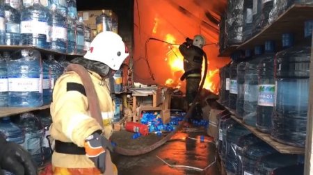 На кадрах с места ЧП видно, что владельцу здания нанесен серьезный ущерб. Помещения со стеллажами, на которых хранятся большие 19-литровые бутыли с водой, сильно обгорели.