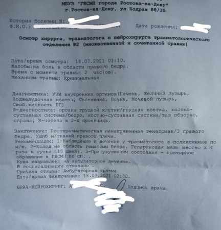 Сейчас девушки ждут заключение судмедэксперта. После чего материалы передадут в полицию. Так, в выписке Татьяны из больницы сказано: посттравматическая ненапряженная гематома правого бедра, ушиб мягких тканей правого плеча.
