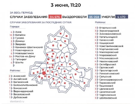 Региональный Роспотребнадзор 3 июня сообщил о 158 новых выявленных инфицированных COVID-19 больных за последние сутки. За весь период пандемии на Дону были заражены 94676 человек, чуть более 10 тысяч дончан болеют в данный момент.