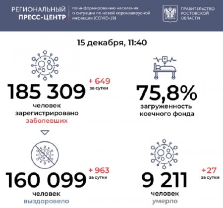 Региональный Роспотребнадзор 15 декабря сообщил о новых 649 заразившихся коронавирусом в Ростовской области за сутки. За весь период пандемии на Дону было инфицировано 185309 человек, из них 160099 человек уже выздоровели. Как сообщает Региональный пресс-центр, сейчас проходят лечение от COVID-19 15 999 дончан.