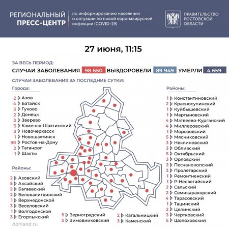 Региональный Роспотребнадзор 27 июня сообщил о 207 новых заразившихся коронавирусом за сутки в Ростовской области. Общее количество заболевших за весь период пандемии на Дону приближается к ста тысячам и составляет на сегодняшний день 98650 человек.