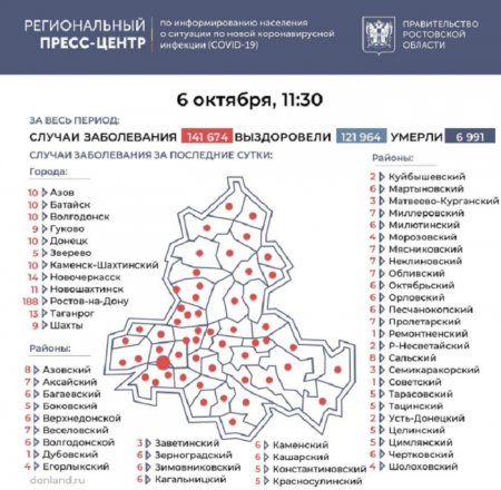 Региональный Роспотребнадзор 6 октября сообщил о 514 новых заболевших коронавирусной инфекцией, и этом максимальный показатель за период пандемии. COVID-19 выявлен фактически во вех городах и районах Дона. Лидерами статистики стали Ростове (188), Новочеркасск (14), Таганрог (13), Новошахтинск (11), Азов (10) и Батайск (10).