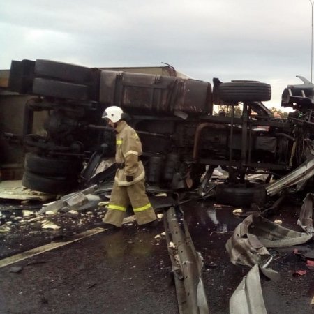 Спасатели отключили аккумуляторные батареи в большегрузе, что помогло избежать короткого замыкания, а следовательно и пожара. Поскольку при опрокидывании из топливного бака вылилась солярка. В настоящее время на месте устраняются последствия ДТП, в частности спасатели смывают топливо с трассы и восстанавливают отбойник. Фуру поднимают с помощью автокрана.