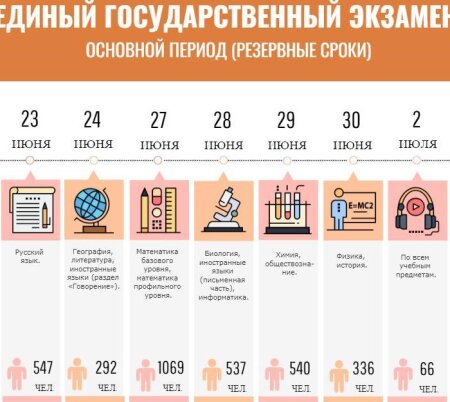 В четверг, 23 июня, уже прошел ЕГЭ по русскому языку, а 24 июня - по географии, литературе и устная часть по иностранным языкам. 27 июня состоится экзамен по базовой и профильной математике, 28 июня - по биологии, информатике и письменная часть ЕГЭ по иностранным языкам, 29 июня - по обществознанию и химии, 30 июня - по истории и физике. Резервным днем для сдачи ЕГЭ по всем предметам станет 2 июля.