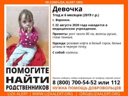 В Воронежской области ищут родителей полуторагодовалой малышки. Брошенную девочку без документов в коляске нашли ночью в Воронеже еще 22 августа. С тех пор ребенок находится в детской больнице. Не исключено, что родственники малышки могут находиться в Ростовской области. О ситуации 3 сентября рассказали волонтеры поискового отряд «Лиза Алерт Юг».