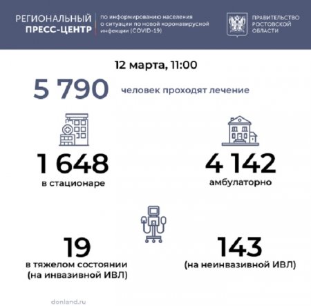 В целом на 12 марта за сутки коронавирусом заразились 243 человека, выявленных в 37 города и районах региона. Лидерами заболеваемости стали следующие города: Ростове (98 человек), Таганрог (9), Азовский район (9), Зерноградский (9), Гуково (7). В Батайске выявлено шестеро новых пациентов.
