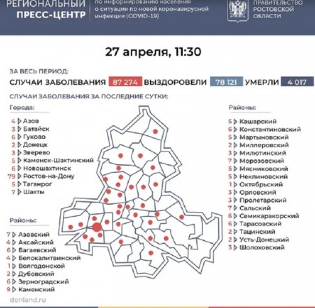 Региональный Роспотребнадзор 27 апреля сообщил также о 13 погибших от инфекции в Ростовской области.
