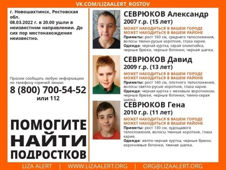 Три школьника – Севрюковы Геннадий, Давид и Александр исчезли из Центра помощи детям вечером 8 марта, передает пресс-служба ГУ МВД России по Ростовской области. И к настоящему времени никакой информации об их местонахождении нет. Мальчики объявлены в розыск по всей Ростовской области, они могут находиться в любом населённом пункте. Их поисками занимается полиция и волонтеры отряда «ЛизаАлерт Юг».