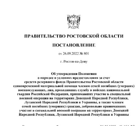 26 сентября губернатор Ростовской области Василий Голубев подписал указ о единовременных выплатах семьям погибших военных, которые участвовали в специальной операции на территории ДНР, ЛНР и Украины.