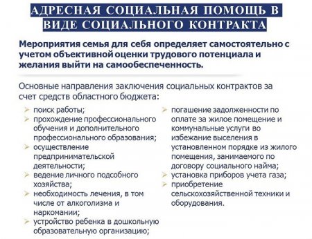 Социальный контракт – это соглашение между малоимущей семьей (гражданином) и органом соцзащиты по выполнению мероприятий для выхода из трудной жизненной ситуации. Человек сам определяет, что именно он будет делать в рамках этого договора. Вариантов несколько: