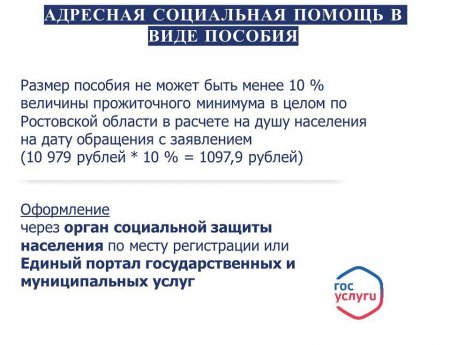 Социальное пособие представляет собой разницу между реальным среднедушевым доходом семьи и прожиточным минимумом для данной категории граждан. Минимальный порог – 10% от прожиточного минимума, что в среднем составляет 1000 рублей.