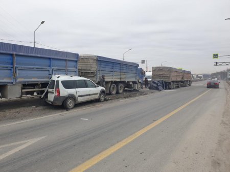 Видео с места событий в социальные сети выложили очевидцы. Два легковых автомобиля, один из которых "Лада Ларгус", врезались в две фуры. По неподтвержденной пока информации, во второй легковушке, которая буквально расплющилась от удара, ехала пожилая пара, и люди выжили.